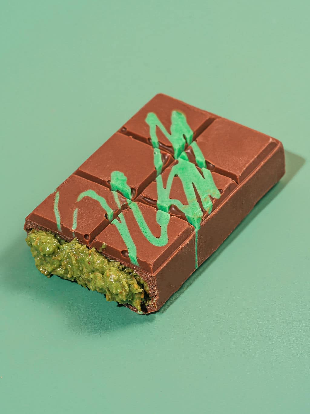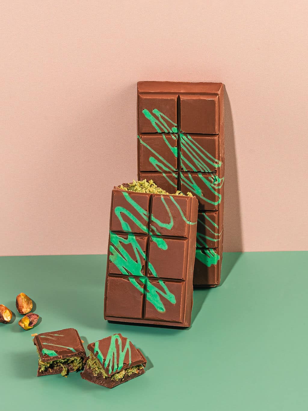 Introducing our Pistachio Dubai Chocolate Bar – a delicious blend of rich, velvety chocolate and the exotic flavours of traditional Middle Eastern knafeh. Each bar features a smooth chocolate shell and a crunchy mix of Pistachio cream, tahini, and knafeh in the center. Available in Milk chocolate.