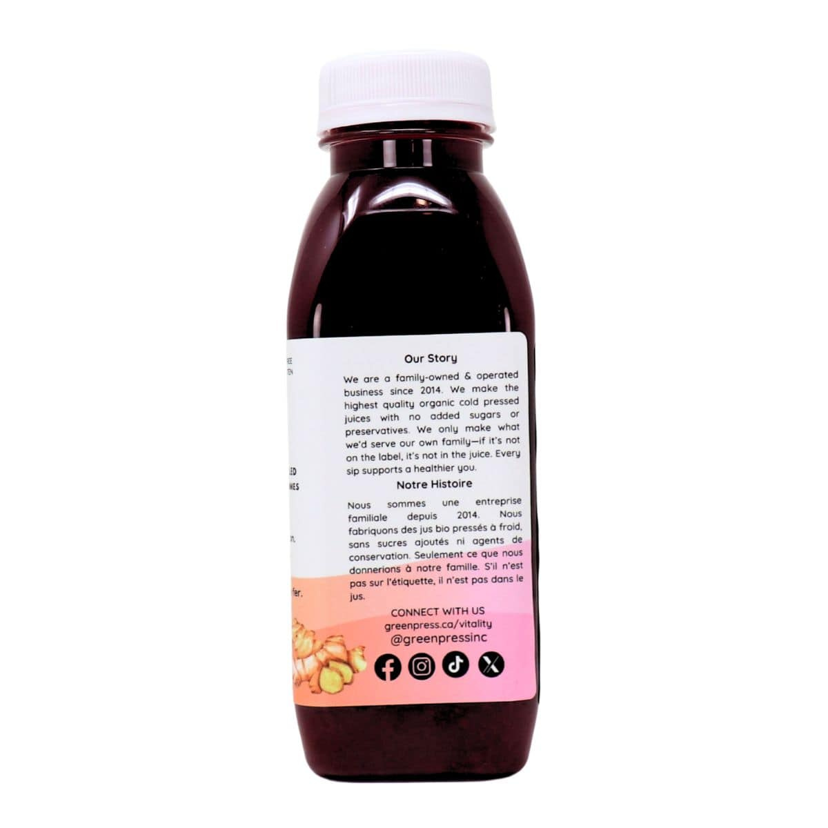 This juice is cold pressed, bottled in recyclable PET plastic, and preserved using High Pressure Processing (HPP) to extend shelf life while maintaining quality and freshness without heat or added preservatives. As part of our Vitality Line, it was created to better serve customers outside of Ontario, allowing us to offer Canada wide shipping. It’s also a great option for those who prefer to stock up on juices without worrying about a shorter shelf life.